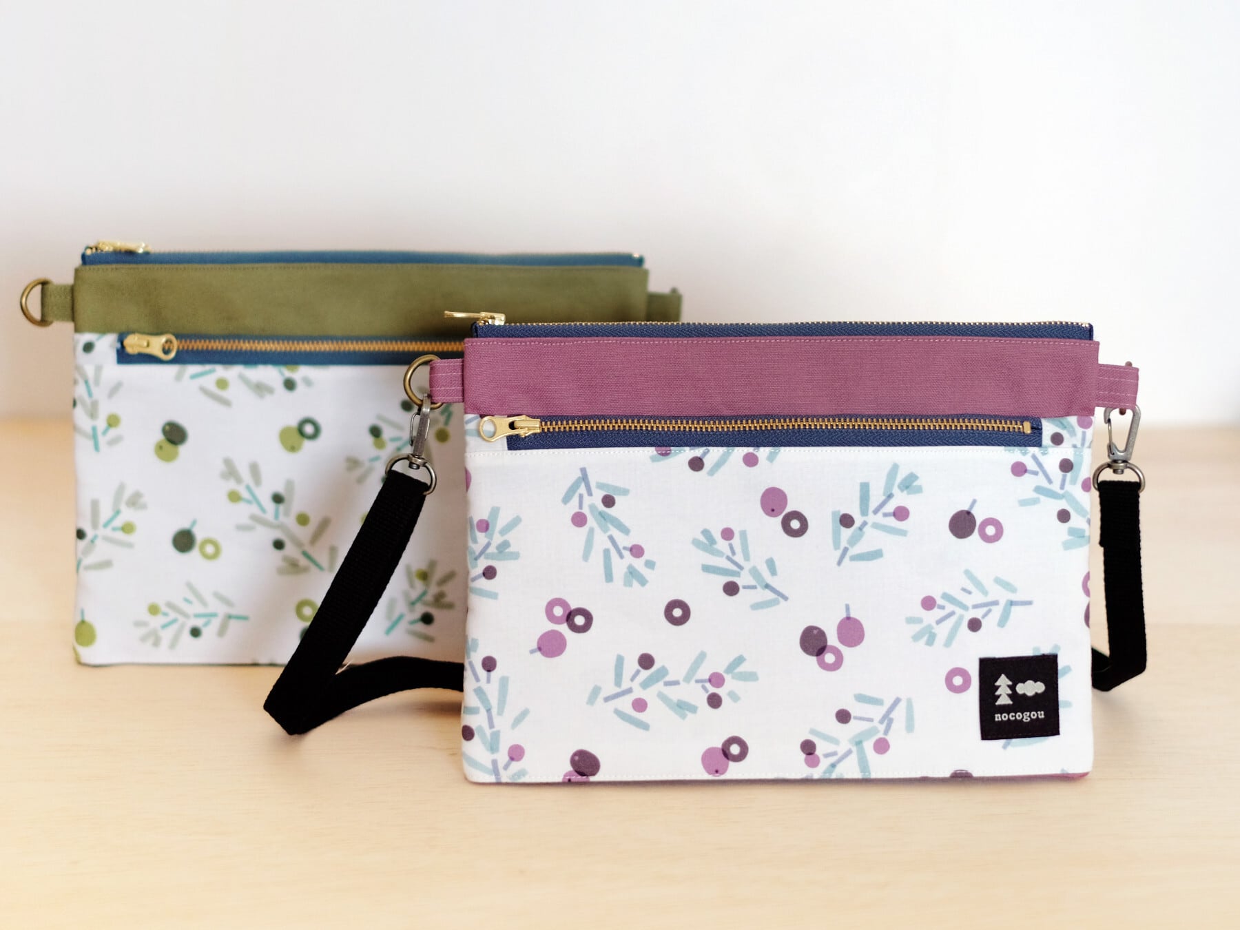 写真1枚目、手前より「パープル」と「グリーン」の2配色です。